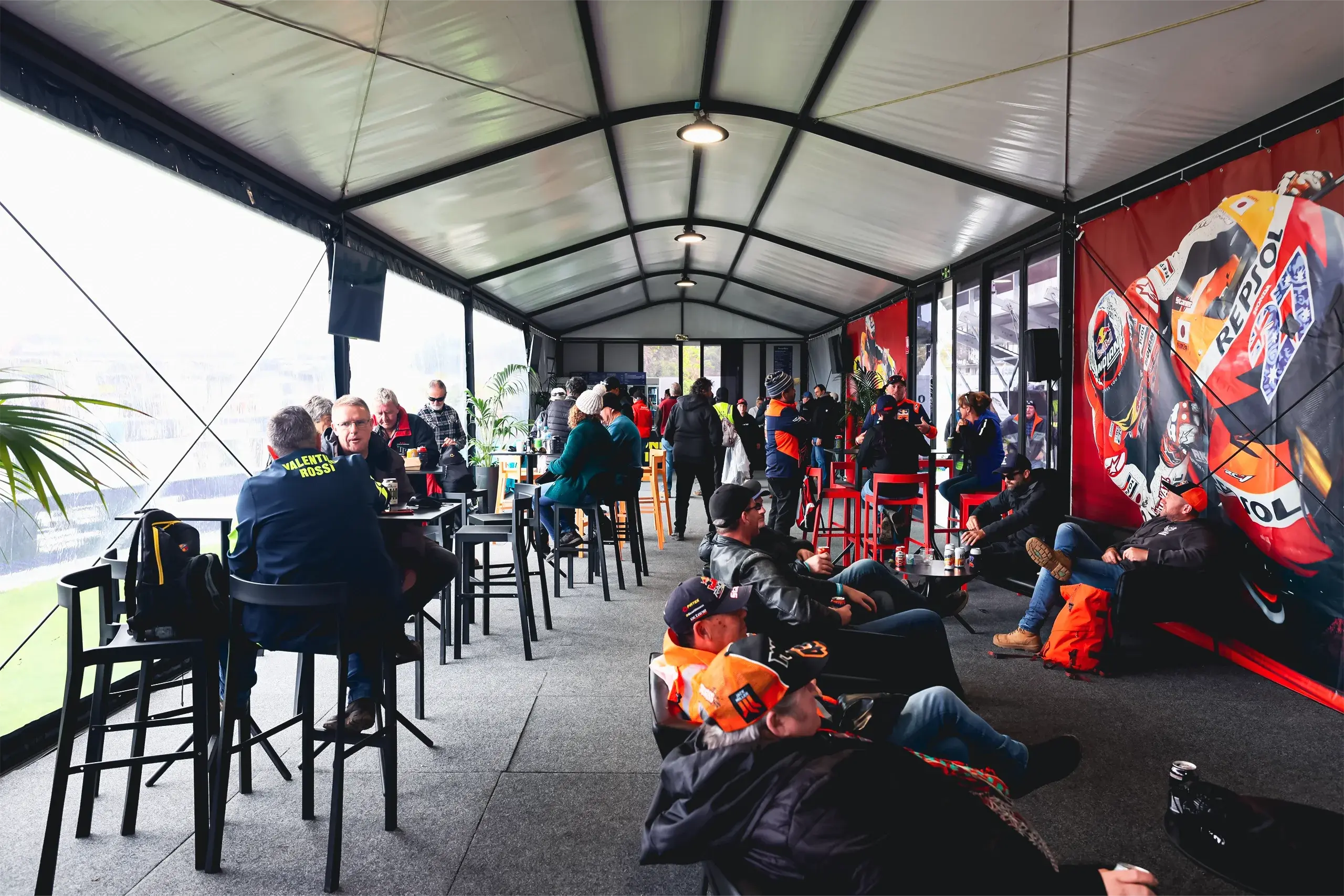 The Trackside Club is situated on the main Gardner Straight with views to the straight, corner 2 and a panorama of the Southern Loop. The fastest part of the track! Watch bikes rocket past, then relax in the undercover marquee with garden lounges, a private bar and nearby food options